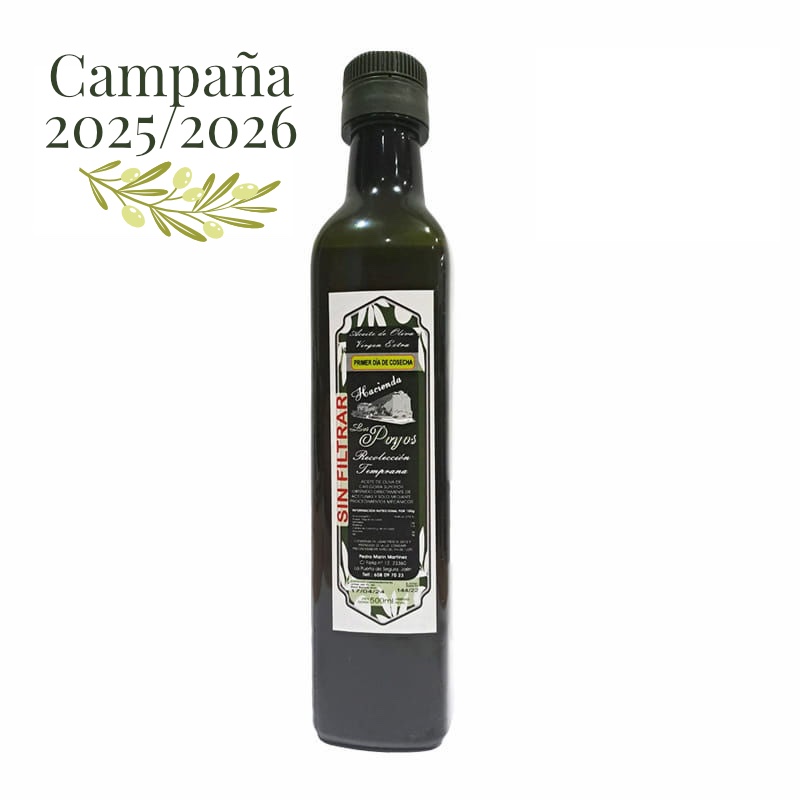 El sabor m谩s temprano y sorprendente de nuestro <strong>Aceite de Oliva Virgen Extra SIN FILTRAR DE recolecci贸n temprana. 馃挌PRIMER D脥A DE COSECHA OCTUBRE 2025 馃挌</strong>Procedente de olivar de monta帽a en la Sierra de Segura. Cosecha recogida en octubre de 2024 sobre una producci贸n limitada y exclusivamente en fr铆o y sin procedimientos mec谩nicos. Los matices del aceite son a verdes herb谩ceos y sabores a tomateras, tiene una suave entrada en el paladar con registros frescos y un toque de amargor muy equilibrado.